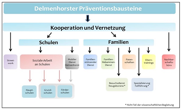 Ein Positivbeispiel einer derartigen Forderung ist hier die Stadt Delmenhorst. "Zur Verbesserung der Situation benachteiligter Kinder, Jugendlicher und ihrer Familien installierte die Stadt Delmenhorst im Jahr 2007 die „Delmenhorster Präventionsbausteine“" (Stadt Delmenhorst 2010, S. 1). Mit diesem Präventionsmodell - eine interdisziplinär vernetzte Konzeption - werden aus dem Setting Kommune die gesundheitsfördernden / präventiven Angebote der gesamten Jugendhilfe abgestimmt und gebündelt. Die Kooperation von den an Erziehung, Bildung, Beratung und Betreuung beteiligten Akteurinnen und Akteure führt somit zur einer Verzahnung und Vernetzung von vorhandenen Präventionsangeboten und -maßnahmen in Delmenhorst (vgl. Stadt Delmenhorst 2010, S. 7). Die theoretische Einbettung der Rahmenkonzeption dieses Modells basiert dabei auf drei Grundpfeilern (Spies 2011, S. 5):
