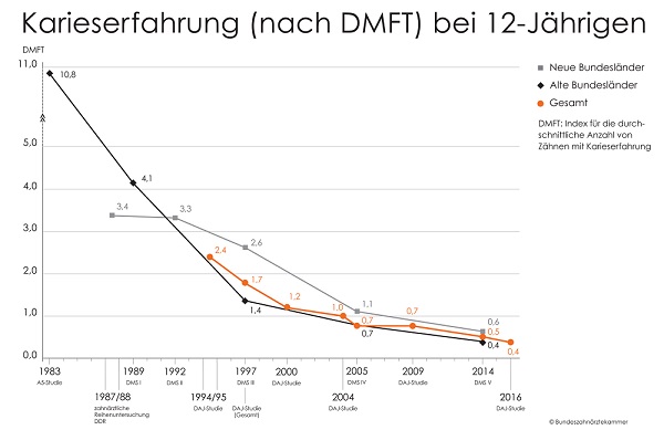 So ist in Deutschland die Zahnkaries bei Kindern (12-Jährige) in den letzten 30 Jahren durch sehr erfolgreiche Präventionsstrategien durchschnittlich um 88 Prozent zurückgegangen. In Deutschland wiesen 12-Jährige im Jahr 2016 lediglich 0,4 löchrige, reparierte oder fehlende Zähne auf, 1989 waren es noch 4,1 betroffene Zähne (s. Abb. 1).