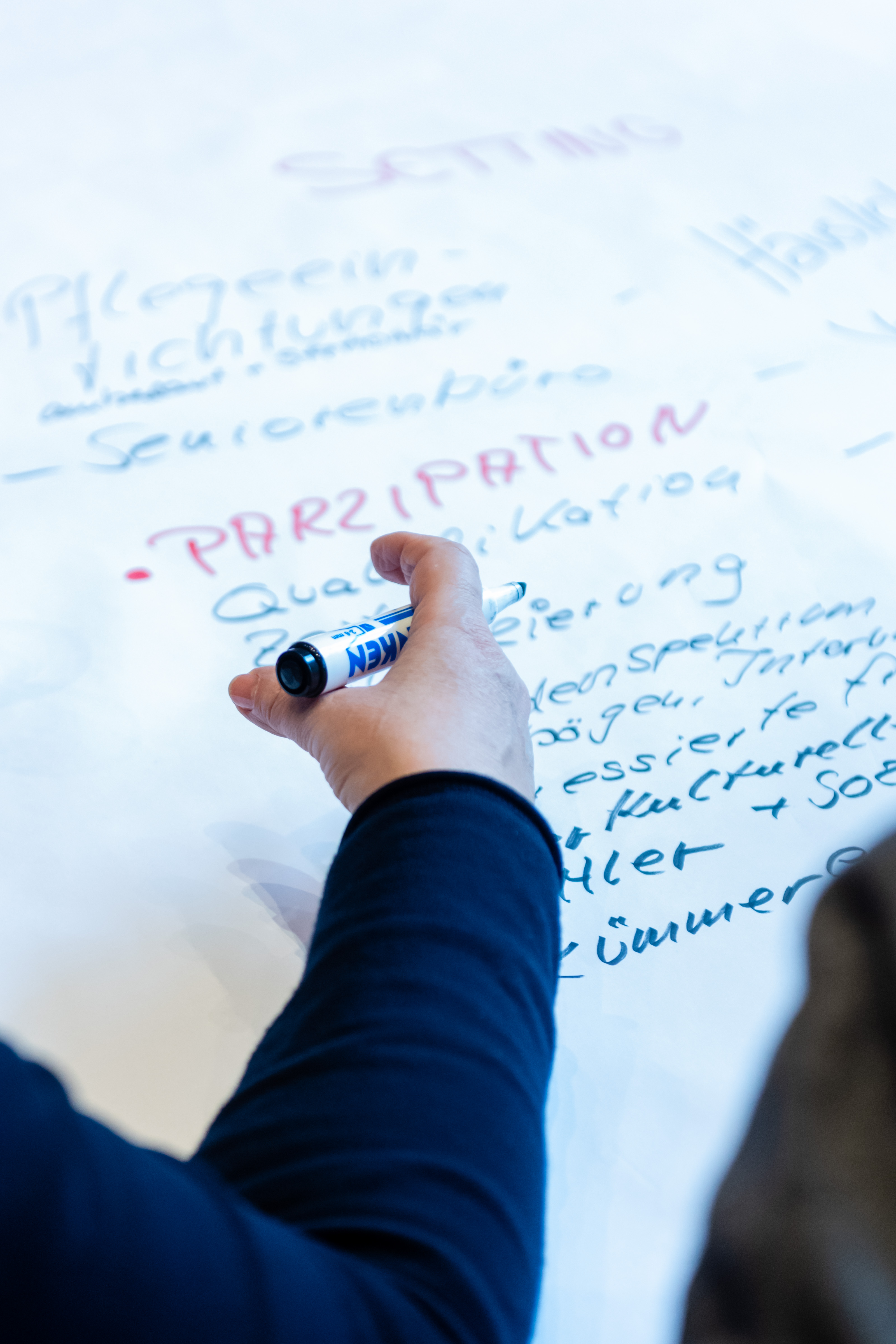 Im Anschluss an die Vorstellung der Arbeitshilfe konnten die Teilnehmenden die einzelnen Kriterien an fünf Pinnwänden vertiefend reflektieren. In einem ersten Schritt wurden aus den Teilnehmenden fünf Gruppen gebildet. Jeder Gruppe wurde ein Good-Practice Kriterium zur intensiven Diskussion zugeordnet, das anhand der unterschiedlichen Expertisen und Erfahrungen aus der Praxis der Teilnehmerinnen und Teilnehmer beleuchtet werden konnte. Im zweiten Schritt hatten die Teilnehmenden die Möglichkeit, ein weiteres Kriterium ihrer Wahl auszuwählen, um erneut in die vertiefende Diskussion zu gehen.