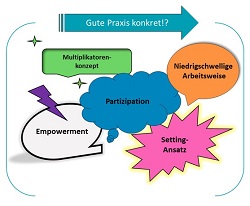 Die Teilnehmerinnen und Teilnehmer hatten während der Präsentation von Frau Nicolai die Möglichkeit, die fünf Good Practice-Kriterien: Setting-Ansatz, Niedrigschwellige Arbeitsweise, Partizipation, Empowerment und Multiplikatoren-Konzeption an Gruppentischen zu diskutieren und die Kriterien auf ihre Umsetzung in die Praxis zu prüfen. Als Anregung dienten erste Reflexionsfragen zu den einzelnen Kriterien.