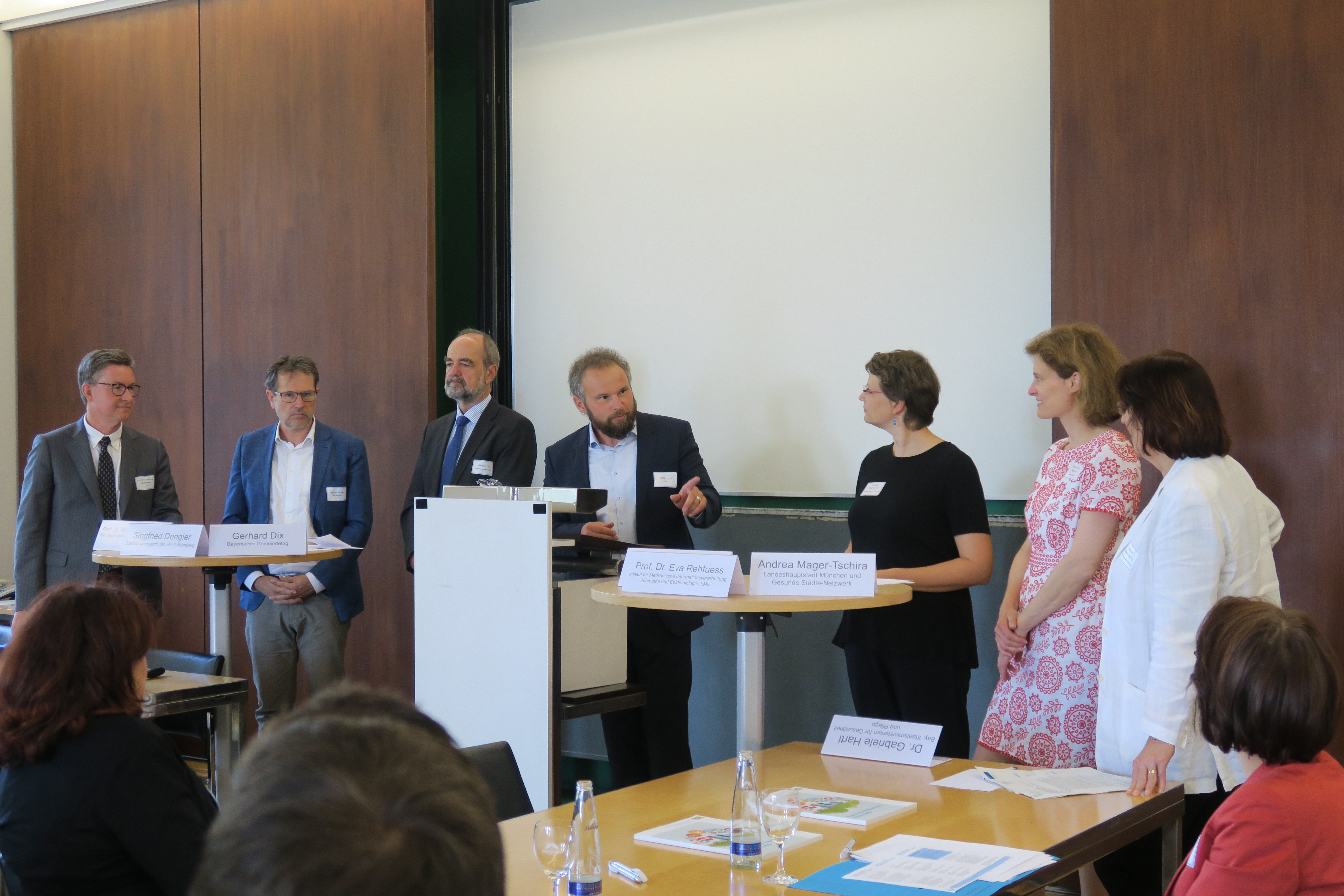 Inwiefern HiAP deutschland- und bayernweit Einzug gehalten hat, muss differenziert betrachtet werden. Das Bewusstsein für mehr intersektorale Kommunikation, Zusammenarbeit und Engagement für Gesundheit ist da, erfordert aber auch eine konsequente Umsetzung. Prof. Dr. Wolfgang Caselmann (Bayerisches Staatsministerium für Gesundheit und Pflege), Siegfried Dengler (Stadtplanungsamt Nürnberg), Gerhard Dix (Bayerischer Gemeindetag), Andrea Mager-Tschira (Landeshauptstadt München und Gesunde Städte-Netzwerk), Prof. Dr. Eva Rehfuess (Ludwig-Maximilians-Universität München) und Franziska Solger-Heinz (Gesundheitsregionplus Passauer Land) waren Teilnehmer der Podiumsdiskussion und schilderten ihre Erfahrungen und Einschätzungen.