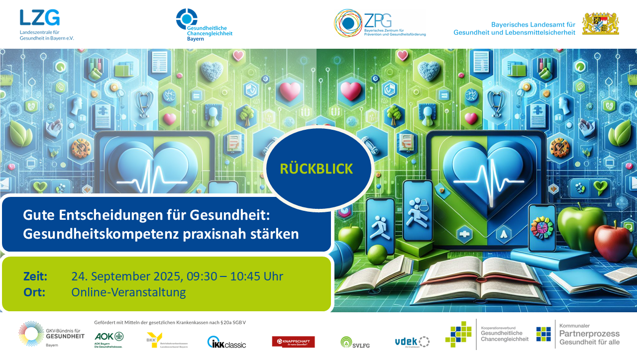 Dazu organisierte die Koordinierungsstelle Gesundheitliche Chancengleichheit Bayern am 24.09.2025 die Online-Veranstaltung „Gute Entscheidungen für Gesundheit: Gesundheitskompetenz praxisnah stärken“, zu der sich rund 290 Teilnehmende aus unterschiedlichsten Berufsgruppen versammelten.