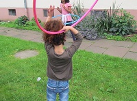 Ein zentrales Ziel der Gemeinwesenarbeit ist es, Begegnung zu ermöglichen - gerne auch in Verbindung mit Bewegung. Maßnahmen wie der „Wandernde Bewohnertreff" am Kuckuck verbessern Integrationsmöglichkeiten und tragen zur Identifikation der Bewohnerschaft mit ihren Stadtteilen bei. Der Bewohnertreff „wandert“ in den Sommermonaten durch das Quartier. Bierzeltgarnituren und Pavillon werden dort aufgeschlagen, wo sich die Menschen aufhalten, nämlich auf den Grünflächen zwischen den Wohngebäuden. Stets mit im Gepäck sind Federbälle, Fußbälle, Stelzen sowie ein Netz für Fußtennis. Damit wird auch für Kinder aus einkommensschwachen Elternhäusern ein differenziertes Sport- und Bewegungsangebot vorgehalten und ein Beitrag zur Chancengleichheit geleistet.