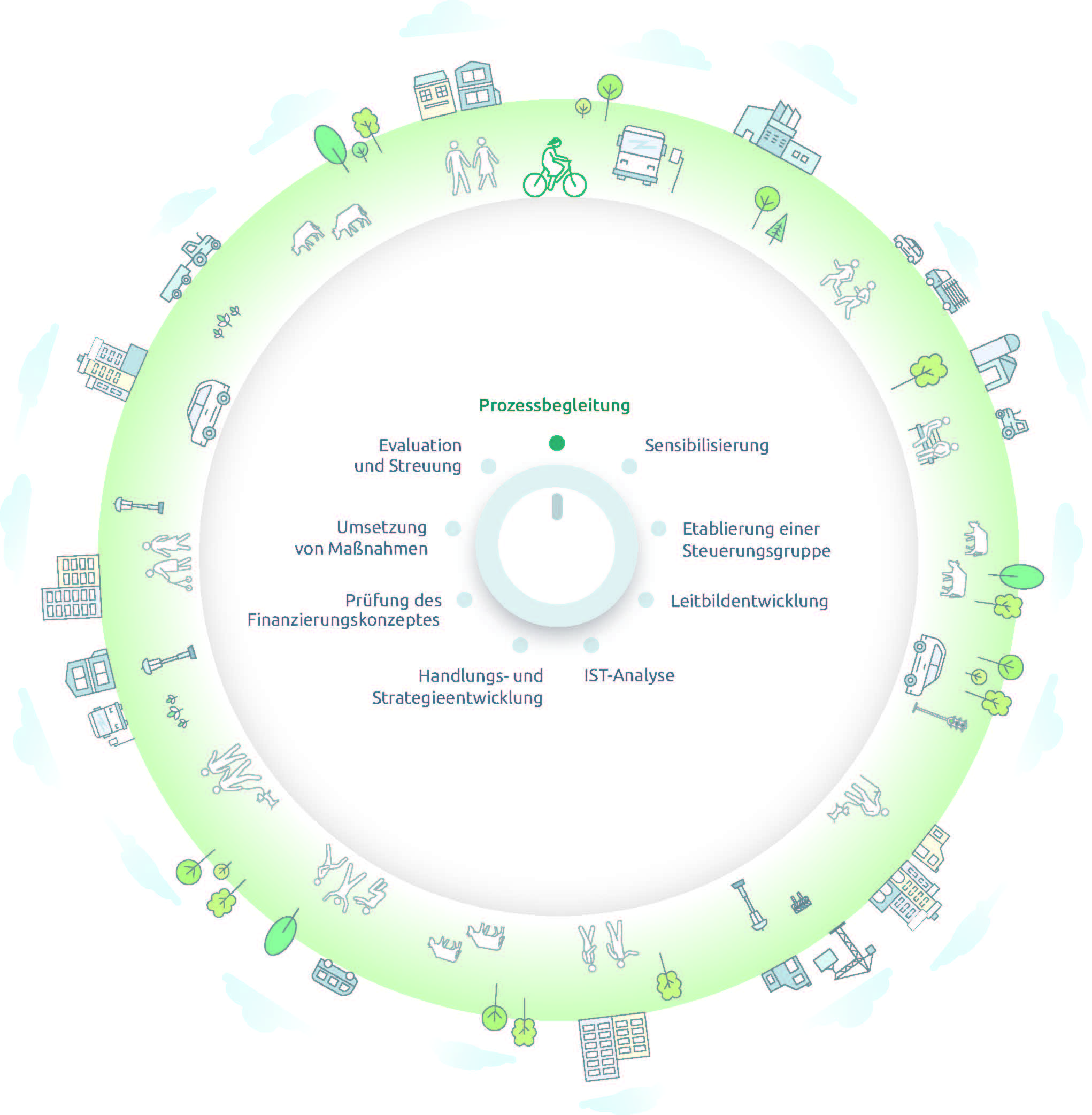 Der Impulsgeber Bewegungsförderung bietet mit dem idealtypischen Prozess der WHO zum Aufbau gesundheits- und bewegungsförderlicher Strukturen ein standardisiertes Vorgehen an, auf das Kommunen flexibel zugreifen können. Denn für den Auf und Ausbau bewegungsförderlicher Strukturen in der Lebenswelt Kommune gibt es kein Patentrezept. Dafür sind Kommunen in ihrer Größe, den vorhandenen Strukturen sowie der Angebotslandschaft zu unterschiedlich. Daher unterstützt der Impulsgeber Bewegungsförderung Kommunen in jeder Phase mit einer interaktiven Prozessbegleitung: