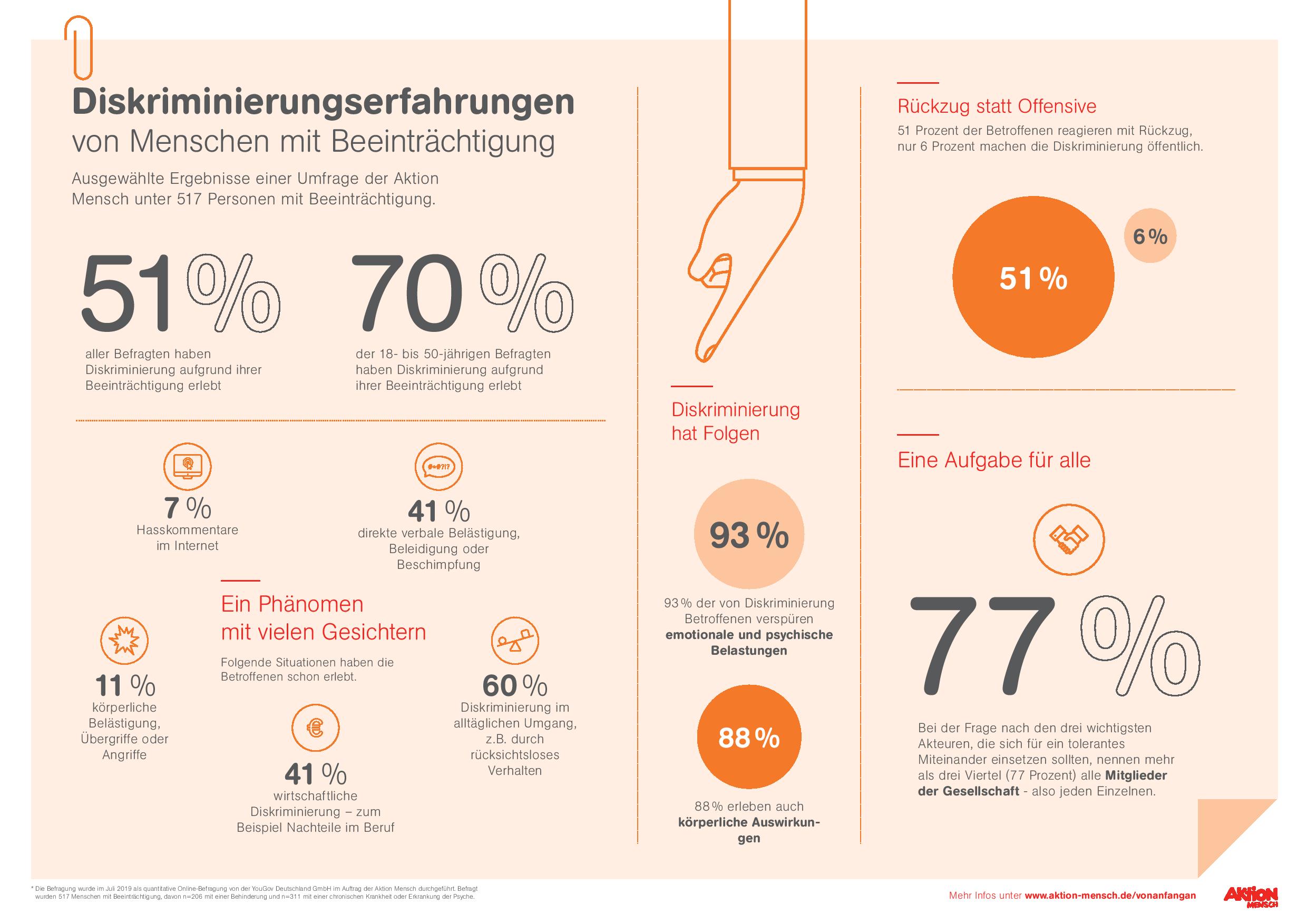 Das belegen die Ergebnisse einer aktuellen Umfrage des internationalen Markt- und Meinungsforsch-ungsinstituts YouGov unter 517 Menschen mit Beeinträchtigungen (hier in Bezug auf Behinderung und chronischen Erkrankungen). Die Befragung wurde von der Aktion Mensch in Auftrag gegeben.