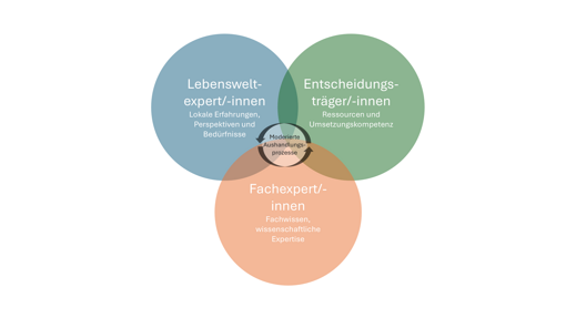 Kooperative Planung basiert auf einem ganzheitlichen Beteiligungs- und Befähigungsansatz zur Entwicklung und Implementation von Interventionen der Gesundheitsförderung und Prävention (Rütten 1997). Ziel dieses integrativen Ansatzes ist es, gesundheitsförderliche Strukturen durch die Beteiligung verschiedener Akteur/-innen zu etablieren. Dabei trägt der primär strukturorientierte Ansatz zugleich zur Förderung von Verhaltensänderungen bei, indem er Reflexions-, Austausch- und Lernprozesse anregt. Im Rahmen der kooperativen Planungsgruppe werden Vertreter/-innen der Zielgruppe als Lebensweltexpert/-innen aktiv in die Zusammenarbeit mit Entscheidungsträger/-innen und Fachexpert/-innen eingebunden (siehe Abbildung 1). In moderierten Aushandlungsprozessen entstehen durch die Verbindung von Lebensweltexpertise, Fachwissen und Entscheidungskompetenz legitimierte und passgenaue Angebotsstrukturen, die auf die spezifischen Bedürfnisse und Möglichkeiten der beteiligten Akteur/-innen vor Ort abgestimmt sind. Dabei handelt es sich um ein systematisches Vorgehen mit festgelegten Beteiligungsstrukturen, definierten Prozessschritten und grundlegenden Qualitätsmerkmalen. Diese sind so konzipiert, dass sie bedarfsorientiert an verschiedene Kontexte und Themenfelder anpassbar sind, um akzeptierte, wirksame und nachhaltige Lösungen entwickeln zu können (Rütten et al. 2024).