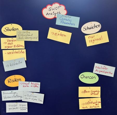 Im Anschluss daran wurden mittels einer SWOT-Analyse drei Projekte der Cannabisprävention auf den Prüfstand gestellt.