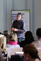 Herr Lange hob die Bedeutung von Medien beim Aufwachsen hervor. Sie sollten aus gesundheitsförderlicher Sicht als wichtiger weiterer Raum für Erfahrung und Entwicklung von Heranwachsenden betrachtet werden, denn: „Medienwelten sind Lebenswelten, Lebenswelten sind Medienwelten“ (Dieter Baacke).