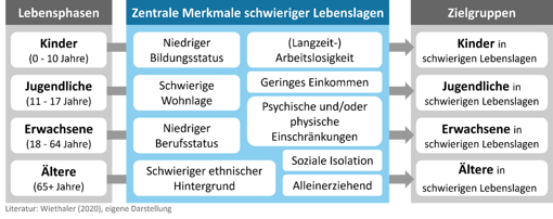 Menschen in schwierigen Lebenslagen sind Personen, die durch ihr Umfeld und ihre Lebensbedingungen so beeinflusst werden, dass sie nicht die gleiche Chance auf ein gesundes Leben haben, wie andere Personengruppen. Zentrale Lebensbereiche wie Bildung, Arbeit, Wohnung, Gesundheit, Freizeitgestaltung und soziale Netzwerke werden durch die Lebenswelten definiert, in die man hineingeboren wird. Menschen in schwierigen Lebenslagen können z. B. Personen ohne Schulabschluss, Arbeitslose, Alleinerziehende und Menschen mit Zuwanderungsgeschichte sein. Sie fühlen sich im Vergleich zu anderen Bevölkerungsgruppen seltener gesund und haben ein höheres Risiko über ihr Leben hinweg zu erkranken. Das liegt daran, dass aufgrund der Lebenslagen die Chancen auf ein gesundes Leben in der Bevölkerung ungleich verteilt sind. Es ist notwendig, flächendeckende und gezielte Maßnahmen zur Förderung gesundheitlicher Chancengleichheit zu planen, umzusetzen und zu evaluieren, damit auch Menschen in schwierigen Lebenslagen eine bestmögliche Chance zur Förderung ihrer Gesundheit erhalten.
