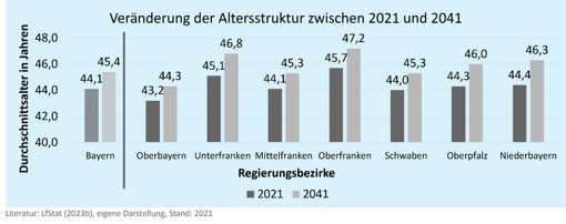 In Bayern beträgt das durchschnittliche Lebensalter im Jahr 2021 44,1 Jahre und es wird mit einem Anstieg um 1,3 Jahre bis zum Jahr 2041 gerechnet (Bayerisches Landesamt für Statistik, 2023b).