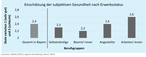 Die subjektive Bewertung des eigenen Gesundheitszustandes auf einer Skala von 1 (sehr gut) bis 5 (schlecht) ergab ein stabiles und gleich gutes Niveau von 2,4. Hinsichtlich des Erwerbstatus gibt es geringfügige Unterschiede, wobei Arbeiterinnen und Arbeiter (2,6) ihren Gesundheitszustand schlechter einschätzen als Angestellte (2,4), Beamtinnen und Beamte (2,2) oder Selbstständige (2,3) (Bayerisches Staatsministerium für Familie, Arbeit und Soziales, 2022).