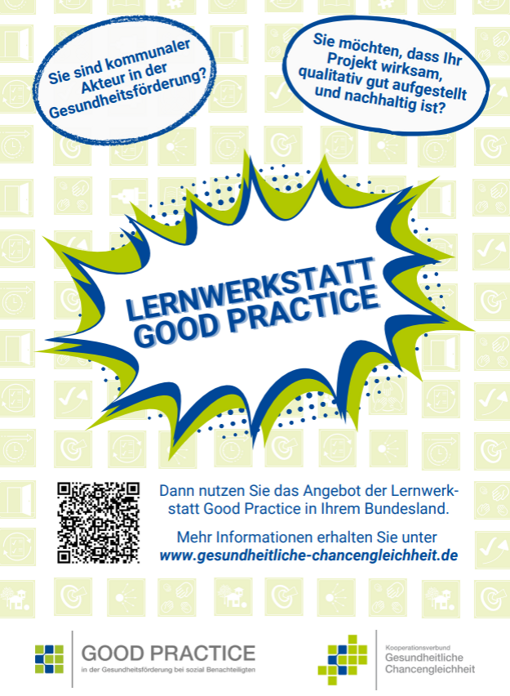 Das Format der Lernwerkstätten Good Practice wird von den Koordinierungsstellen Gesundheitliche Chancengleichheit (KGC) in den jeweiligen Bundesländern organisiert. Die Umsetzung der Lernwerkstätten ist flexibel und abwechslungsreich: Sie finden online, präsent vor Ort, halbtägig, ganztägig oder auch über zwei Tage statt. Je nach Bedarf werden einzelne Good Practice-Kriterien wie Partizipation oder Nachhaltigkeit vertieft oder es wird ein thematischer Schwerpunkt gesetzt.