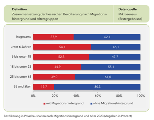 Einen besonders großen Anteil innerhalb dieser Bevölkerungsgruppe stellen Kinder und Jugendliche bis zum Alter von 17 Jahren dar, die somit eine zentrale Rolle in der demografischen Zusammensetzung der Menschen mit Migrationsgeschichte in Hessen einnehmen.
