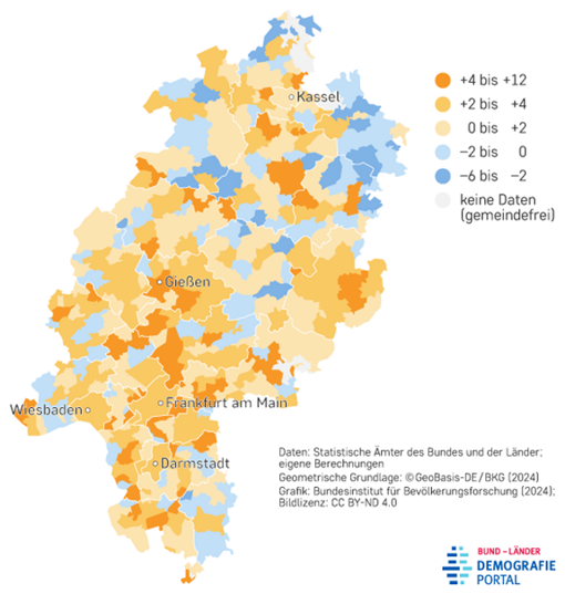 In den vergangenen Jahren verzeichnen viele hessische Gemeinden ein Bevölkerungswachstum. Besonders im ohnehin dicht besiedelten Süden des Landes steigt die Zahl der Einwohner weiter an. Gleichzeitig lebt rund die Hälfte der hessischen Bevölkerung in ländlich geprägten Räumen, die vor allem im Norden des Bundeslands liegen. Dort hingegen verlieren die Gemeinden zunehmend an Bevölkerung (vgl. Abb. 2). Setzt sich dieser Trend fort, entsteht ein deutliches Gefälle zwischen wachsenden und schrumpfenden Regionen (Demografieportal, 2025).