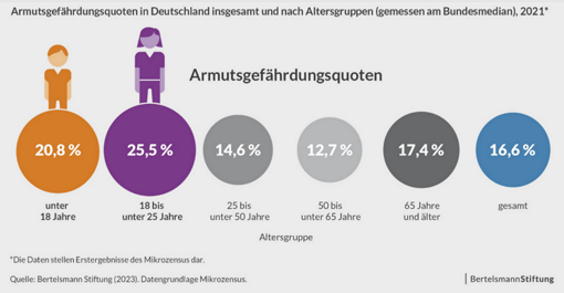 Auf bundesweiter Ebene zeigen die Daten, dass insbesondere Kinder, Jugendliche und junge Erwachsene bis 25 Jahre sowie Senior*innen ab 65 Jahren ein erhöhtes Armutsrisiko haben (vgl. Abb. 6). Besonders auffällig ist die hohe Armutsgefährdungsquote bei jungen Erwachsenen zwischen 18 und 25 Jahren, die im Vergleich zu anderen Altersgruppen am stärksten betroffen sind. Auch ältere Menschen über 65 Jahre weisen ein überdurchschnittliches Armutsrisiko auf.