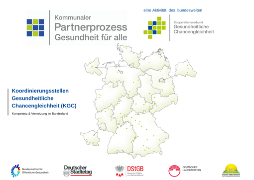 Der kommunale Partnerprozess "Gesundheit für alle" wird getragen von den Partner*innen BIÖG, Deutscher Städtetag, Deutscher Städte- und Gemeindebund, Deutscher Landkreistag und dem Gesunde Städte Netzwerk. Zentrale Anlaufstellen in den Bundesländern sind die Koordinierungsstellen Gesundheitliche Chancengleichheit (KCG).