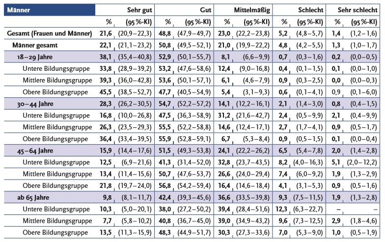- Befragte aus den oberen Bildungsgruppen schätzen ihre Gesundheit deutlich positiver ein als diejenigen aus den unteren Bildungsgruppen; dieser Bildungsgradient tritt bei Frauen noch ausgeprägter als bei Männern auf.