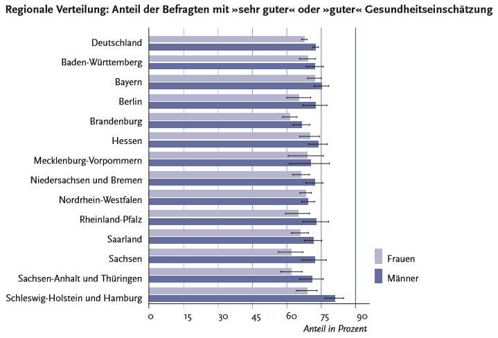 - Ein regionaler Vergleich zeigt, dass Frauen in Bayern und Männer in BadenWürttemberg ihre Gesundheit besser einschätzen als der Bundesdurchschnitt; unter dem Bundesdurchschnitt dagegen liegen die Einschätzungen »sehr guter oder guter« Gesundheit für Frauen in der Region Ost (Süd) und Männer in der Region Mitte.