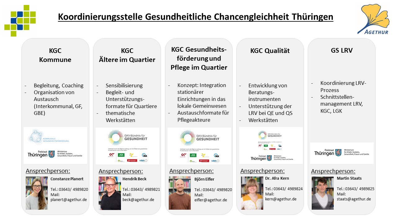 Die Koordinierungsstelle Gesundheitliche Chancengleichheit (KGC) Thüringen setzt sich dafür ein, die Lebens- und Versorgungsqualität hilfe- und pflegebedürftiger älterer Menschen zu fördern, indem stationäre Altenpflegeeinrichtungen als gesundheitsfördernde Orte im Sozialraum etabliert werden.
